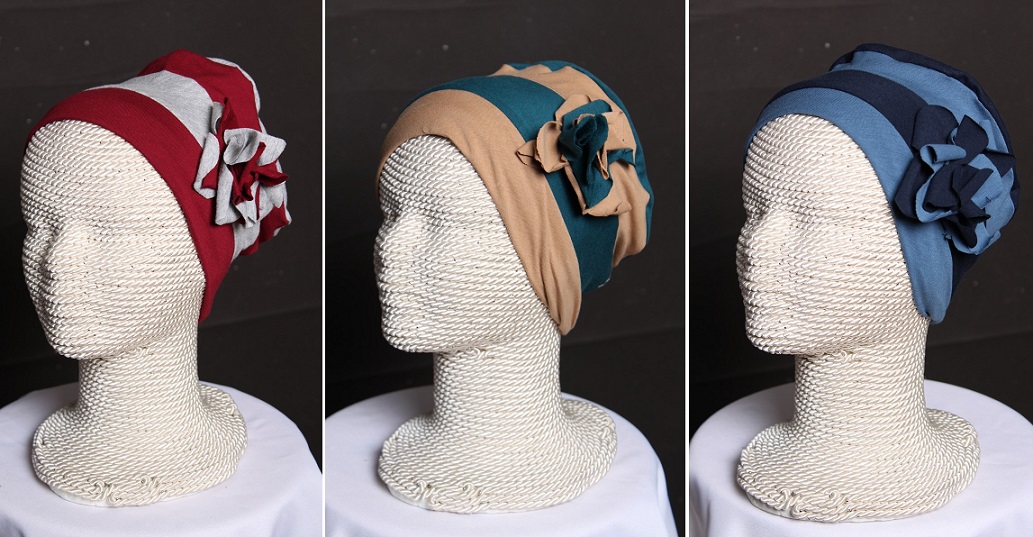 Turbante para quimioterapia con un diseño desenfadado. Dispone de la opción de ser reversible para lograr un color liso y la posibilidad de quitar la flor.